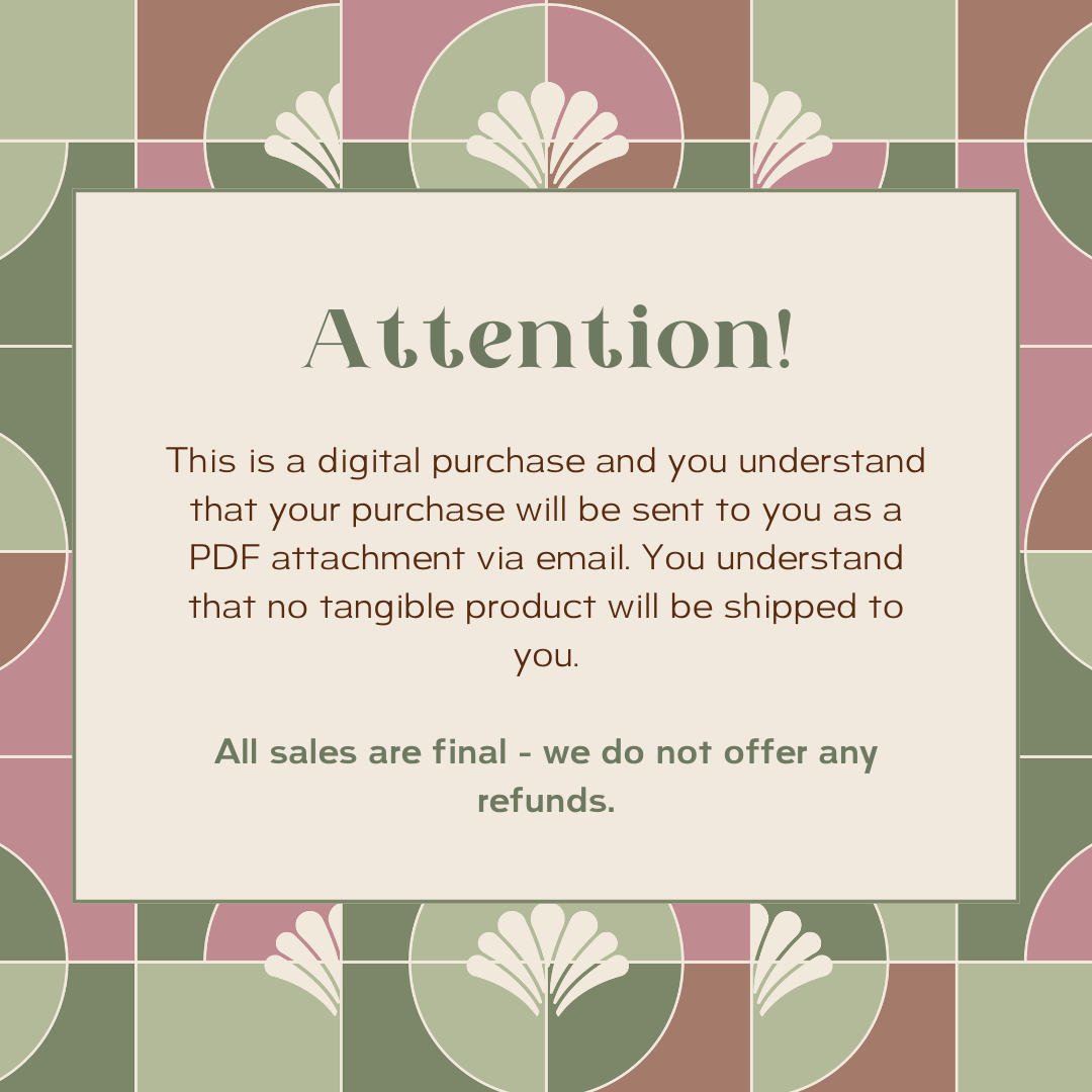1) This is a digital purchase and you understand that your purchase will be sent to you as a PDF attachment via email. You understand that no tangible product will be shipped to you.